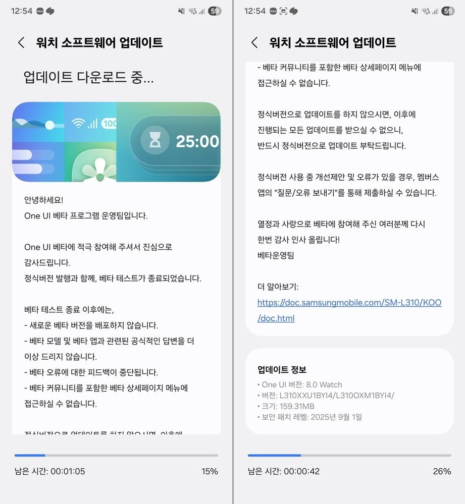 Galaxy Watch 7 için Wear OS 6 tabanlı kararlı One UI 8 Watch güncellemesi, L310XXU1BYI4 yazılım sürümüyle geliyor ve Eylül 2025 güvenlik düzeltme ekini içeriyor. Beta test kullanıcıları için indirme boyutu yaklaşık 160 MB. Diğer kullanıcılar içinse güncellemenin indirme boyutu muhtemelen yaklaşık 2 GB olacak.